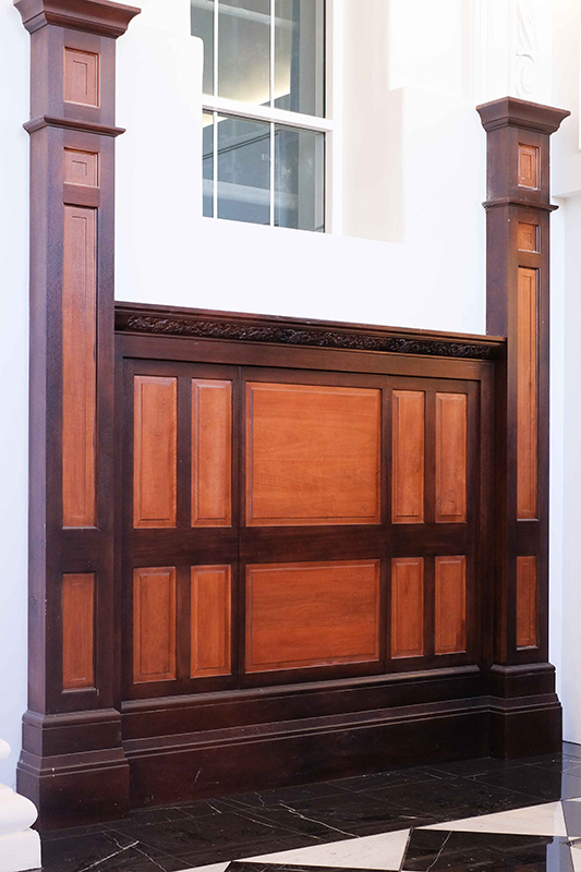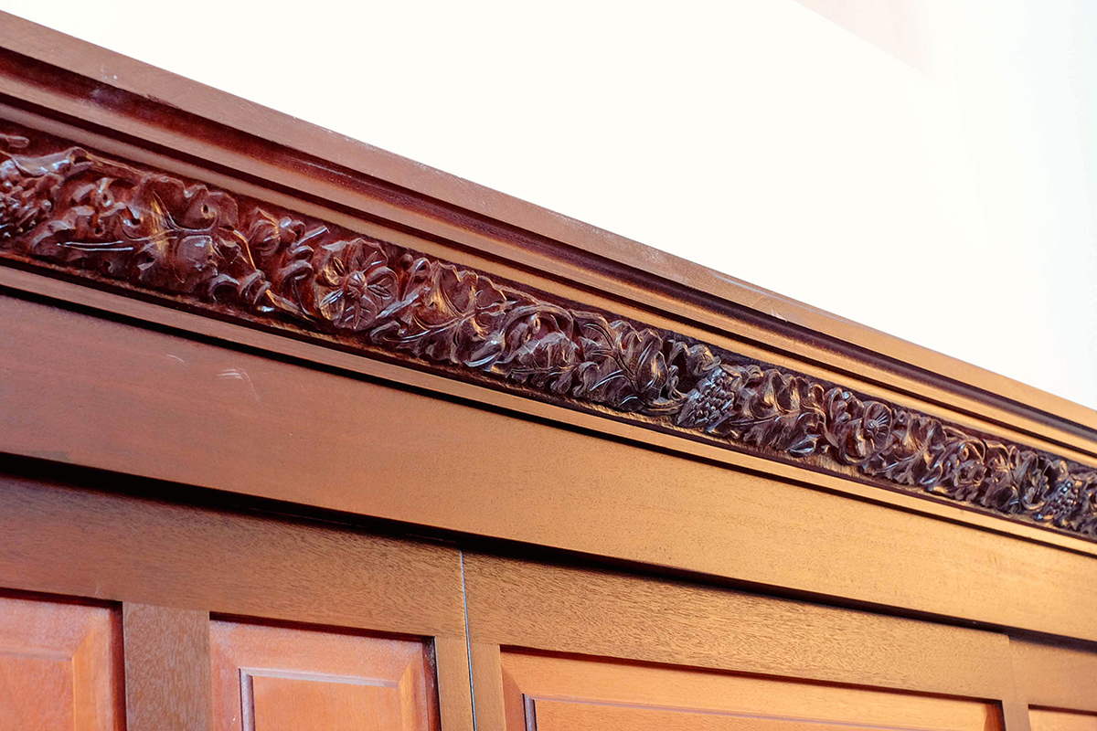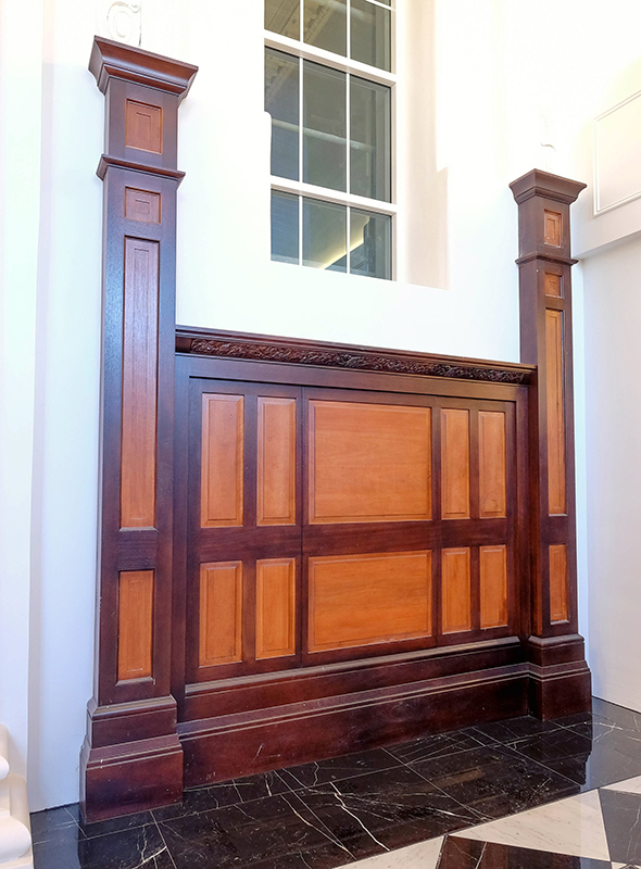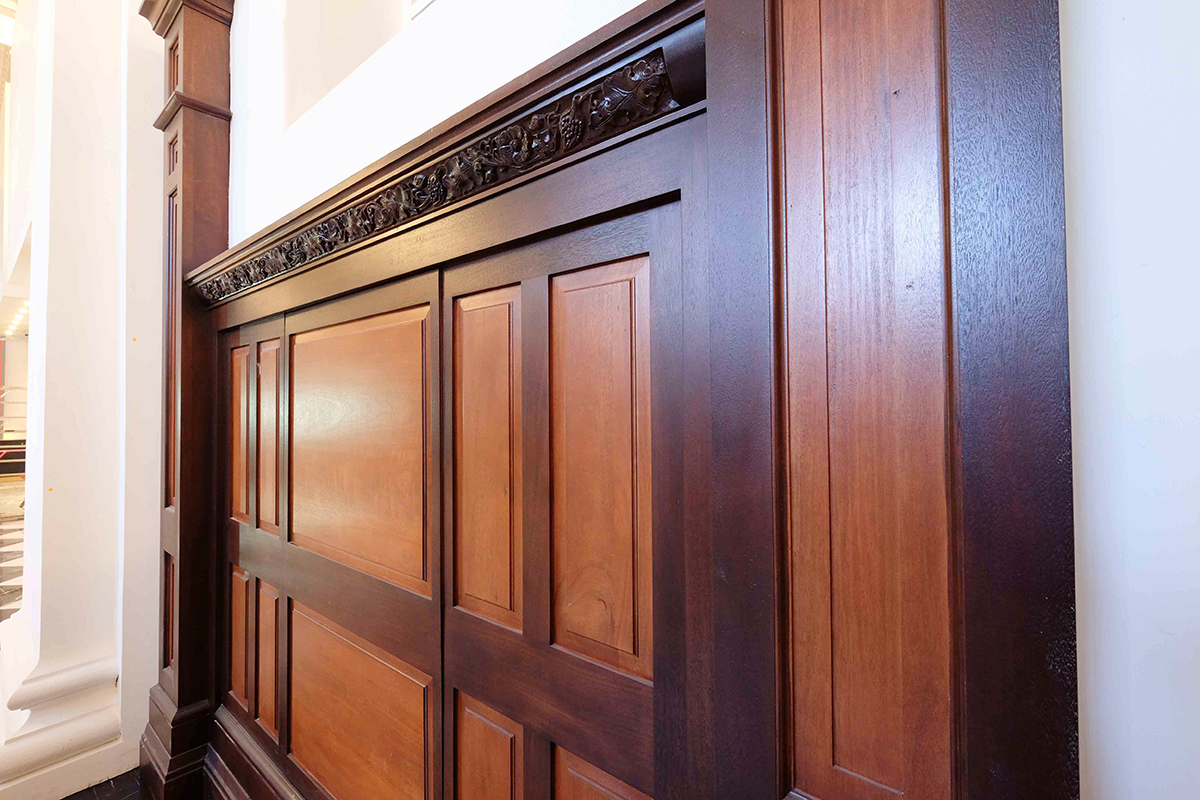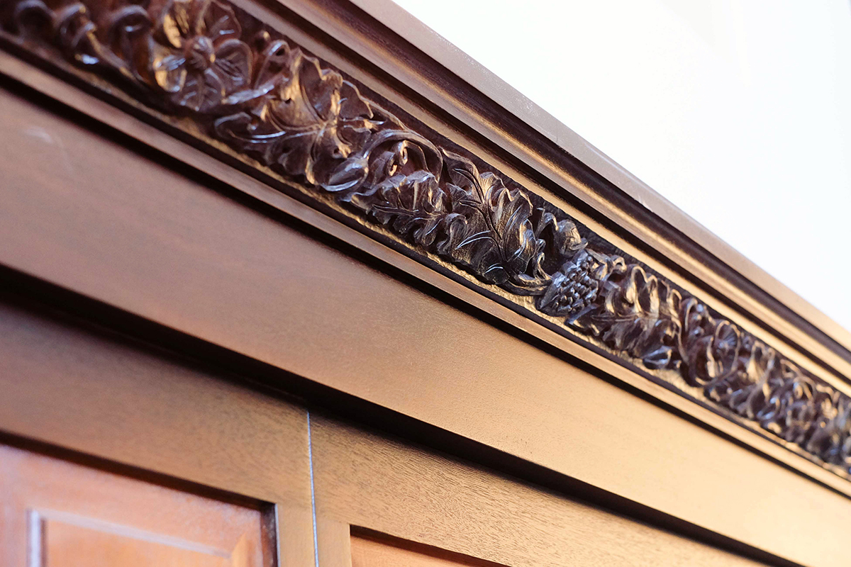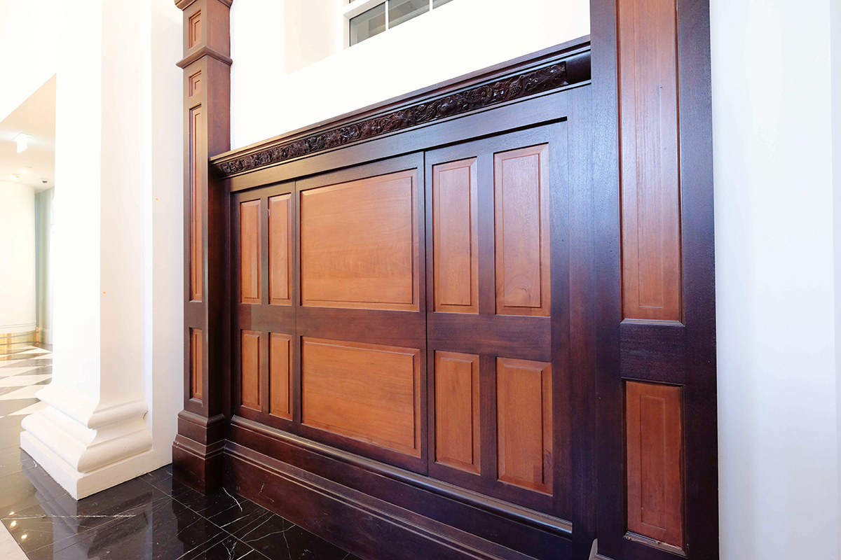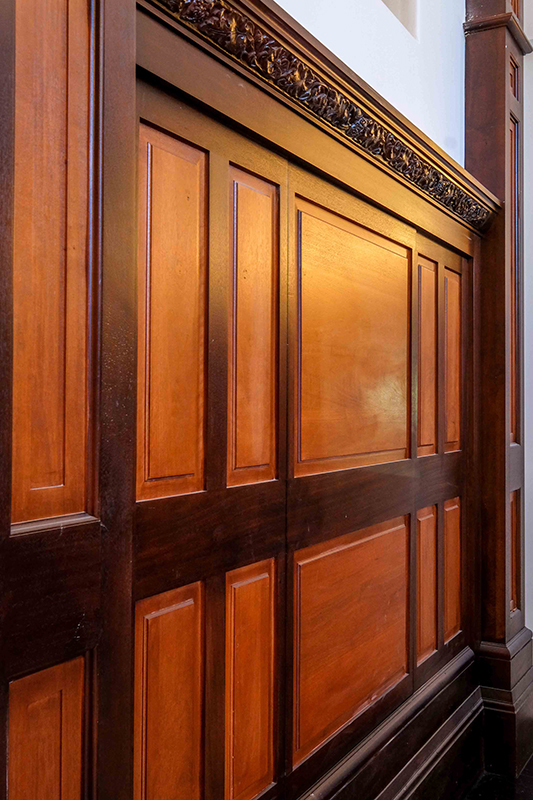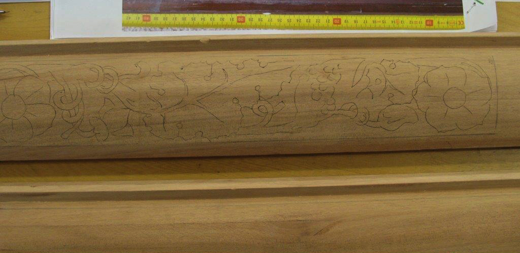 This project was challenging, the carvings were of a very old style, which took much skill and time to recreate, the Crown mouldings were a large mould which we would have to make new cutters for. The timber used had to match the old sections.
