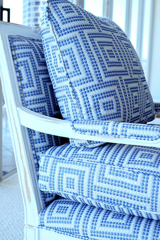 Our team also aged the Lounge chairs and coffee table, in a blue/white wash finish.